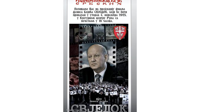 Културни центар „Брана Црнчевић“ у Руми данас, 4. новембра 2025. године, биће домаћин пројекције документарног филма „Свједок“ аутора Дениса Бојића, снимљеног у продукцији Радио-телевизије Републике Српске.