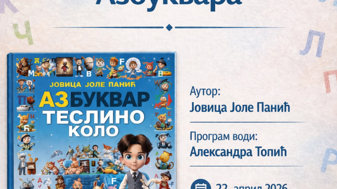 у 18 часова, у Читаоници Библиотеке. „Азбуквар“ је намењен деци предшколског узраста, са циљем да кроз игру и илустрације олакша усвајање првих слова и подстакне жељу детета да самостално пише. О настанку и примени овог едукативног материјала, као и о његовом значају у савременој настави и раду са децом ће нешто више рећи аутор Јовица Панић. Програм ће водити библиотекарка Александра Топић.